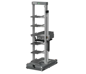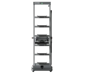 • Versatility, manoeuvrability and heavy load handling. With a slim 100cm body width, the robot can effortlessly navigate through narrow aisles as wide as 112 cm. The back tray supports an impressive high load capacity of 50 kg per layer, totalling up to 6 layers. Docking height 40-400cm.